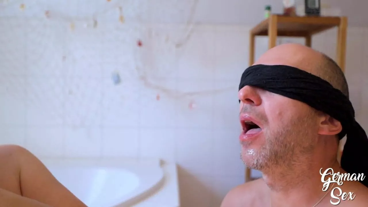 Dutch girl with needle pierced tits sucks cock and gets his cum in her eye